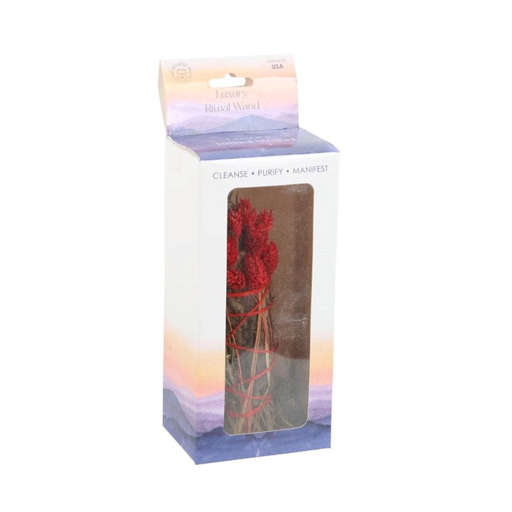 The act of ‘smudging’ is a traditional Native American practice used to cleanse and purify spaces using the smoke of burning sacred herbs. Sustainably sourced and made in the USA, this beautiful ritual wand features fragrant rosemary, yerba santa sage and dried red flowers thoughtfully handtied into a tight bundle for burning and display. To use, light the end of the sage stick and allow to smoulder, place into a heat-resistant bowl or shell and gently disperse the smoke throughout the area to dispel negative energies. Fully extinguish after use and keep away from pets and children.